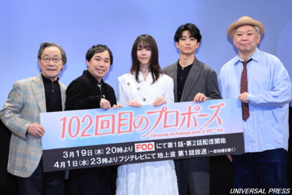 ドラマ『102回目のプロポーズ』の完成披露イベントが、3月19日(木)フジテレビで開催され、出演者の唐田えりか、せいや(霜降り明星)、伊藤健太郎、武田鉄也、企画を担当した鈴木おさむが登壇!ドラマ『102回目のプロポーズ』完成披露イベント19...
