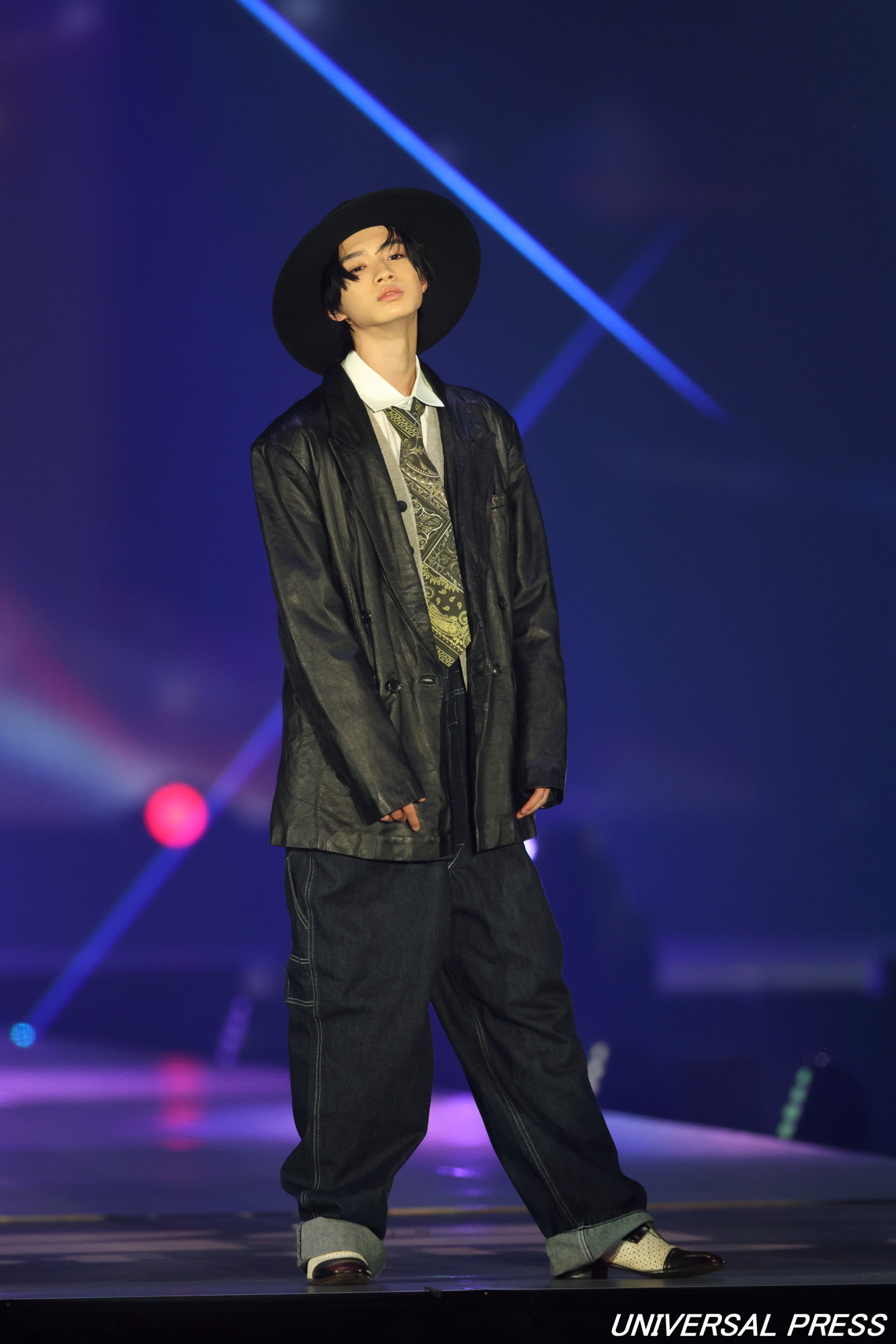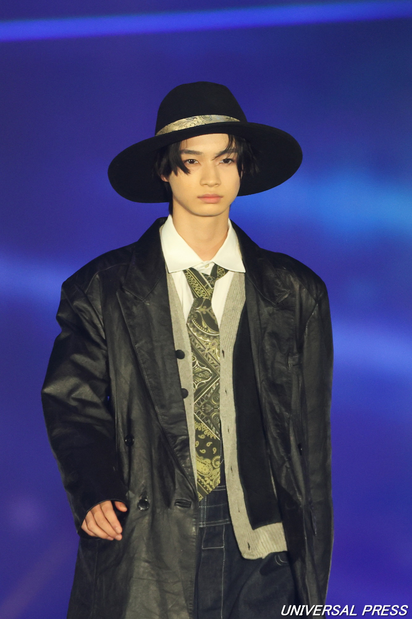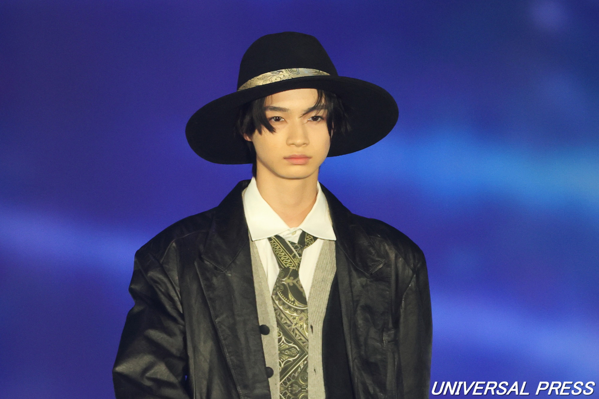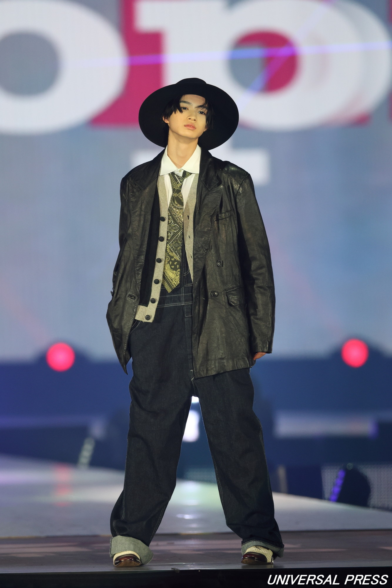この日はヴィンテージやインポートアイテムを取り扱う「Top of the Hill」のステージに登場!映画『国宝』で共演した黒川想矢に続いて登場した越山は印象的なビッグハットにオーバーシルエットのレザージャケット、デニム生地のオーバーオールという難しいコーデを着こなし堂々とランウェイを披露した。