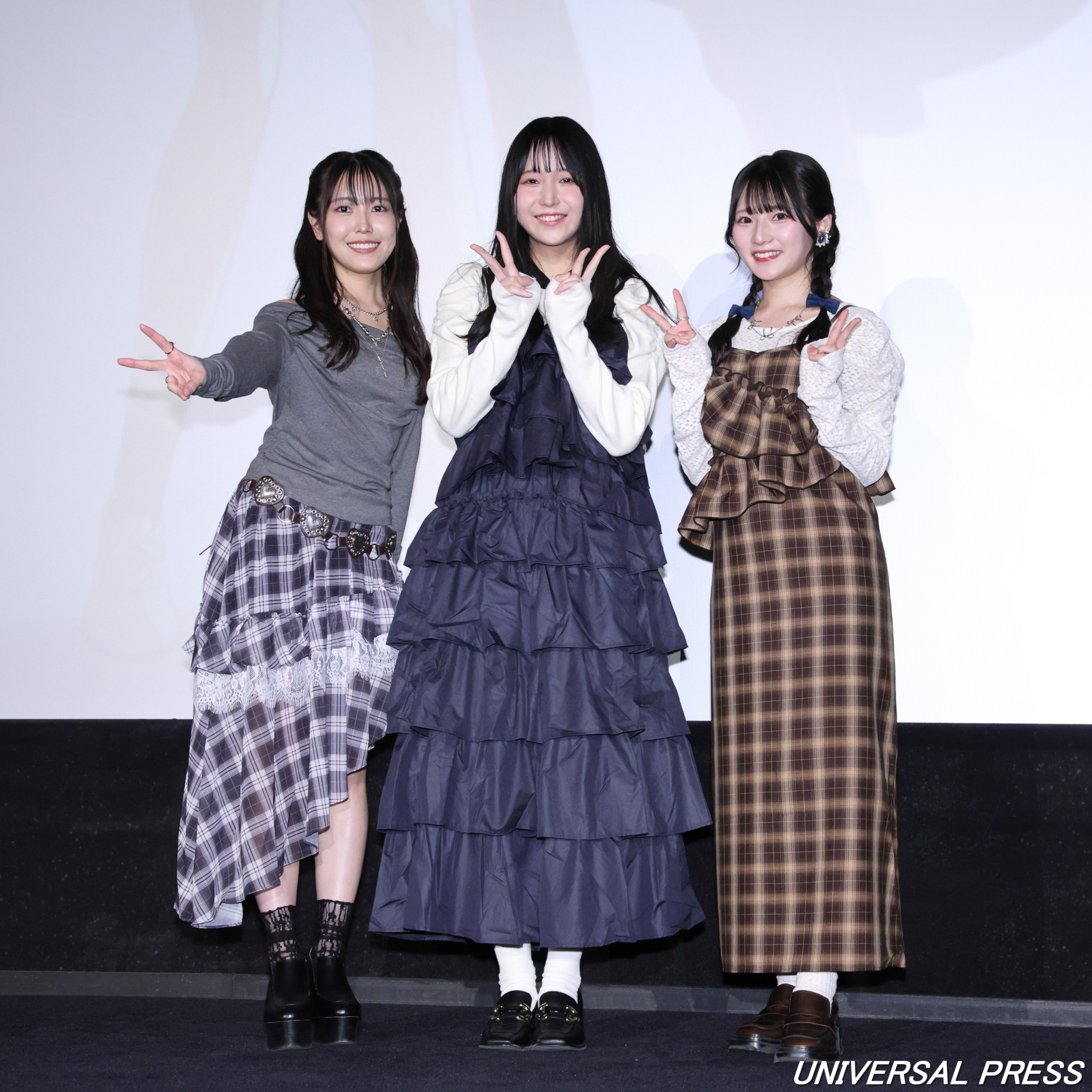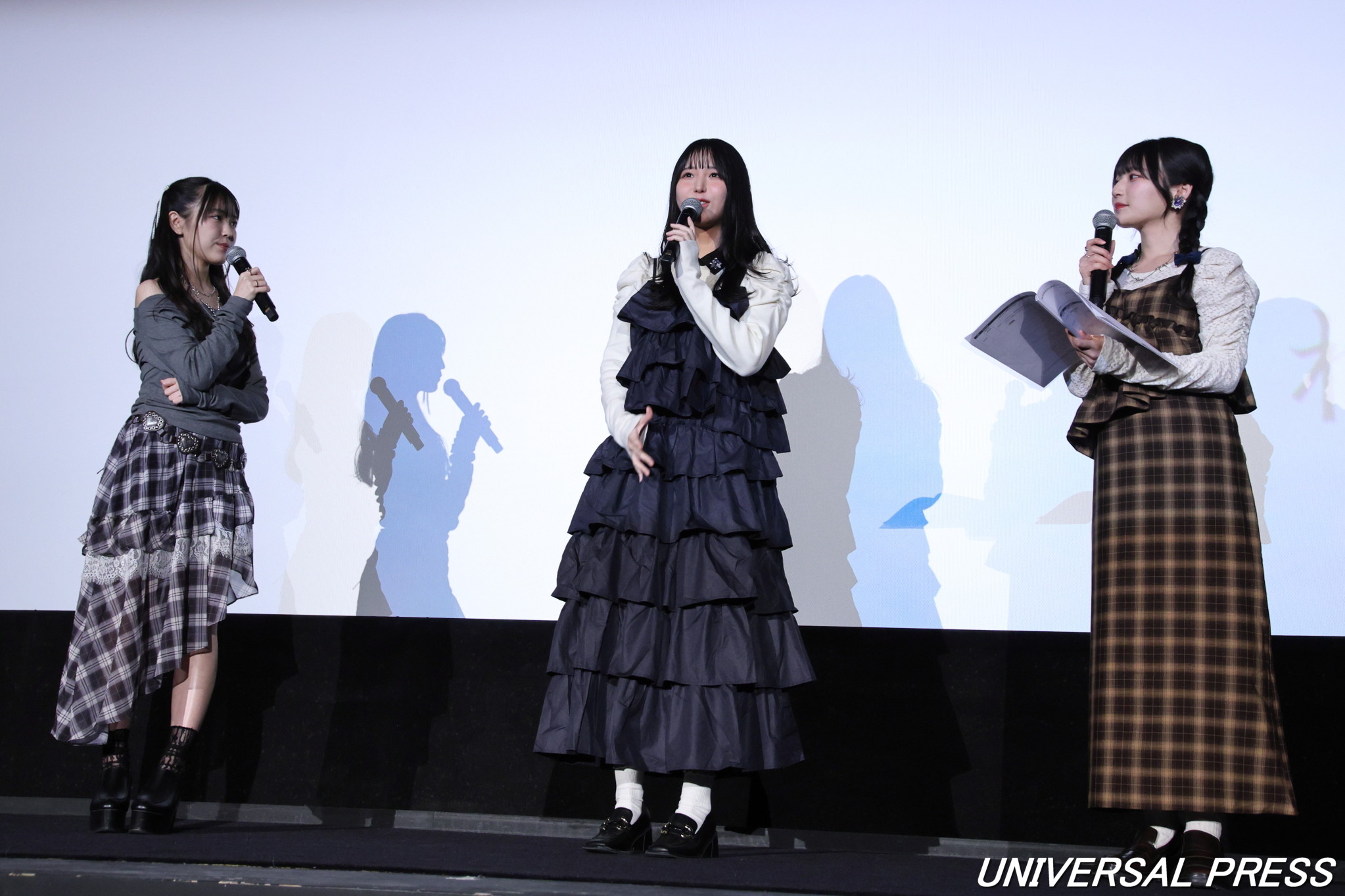 映画『MyGO!!!!!×Ave Mujica合同ライブ「わかれ道の、その先へ」 LIVE FILM』舞台挨拶が11月3日(月・祝)イオンシネマ板橋で開催され、羊宮妃那、立石凛、青木陽菜の3人が登壇した。