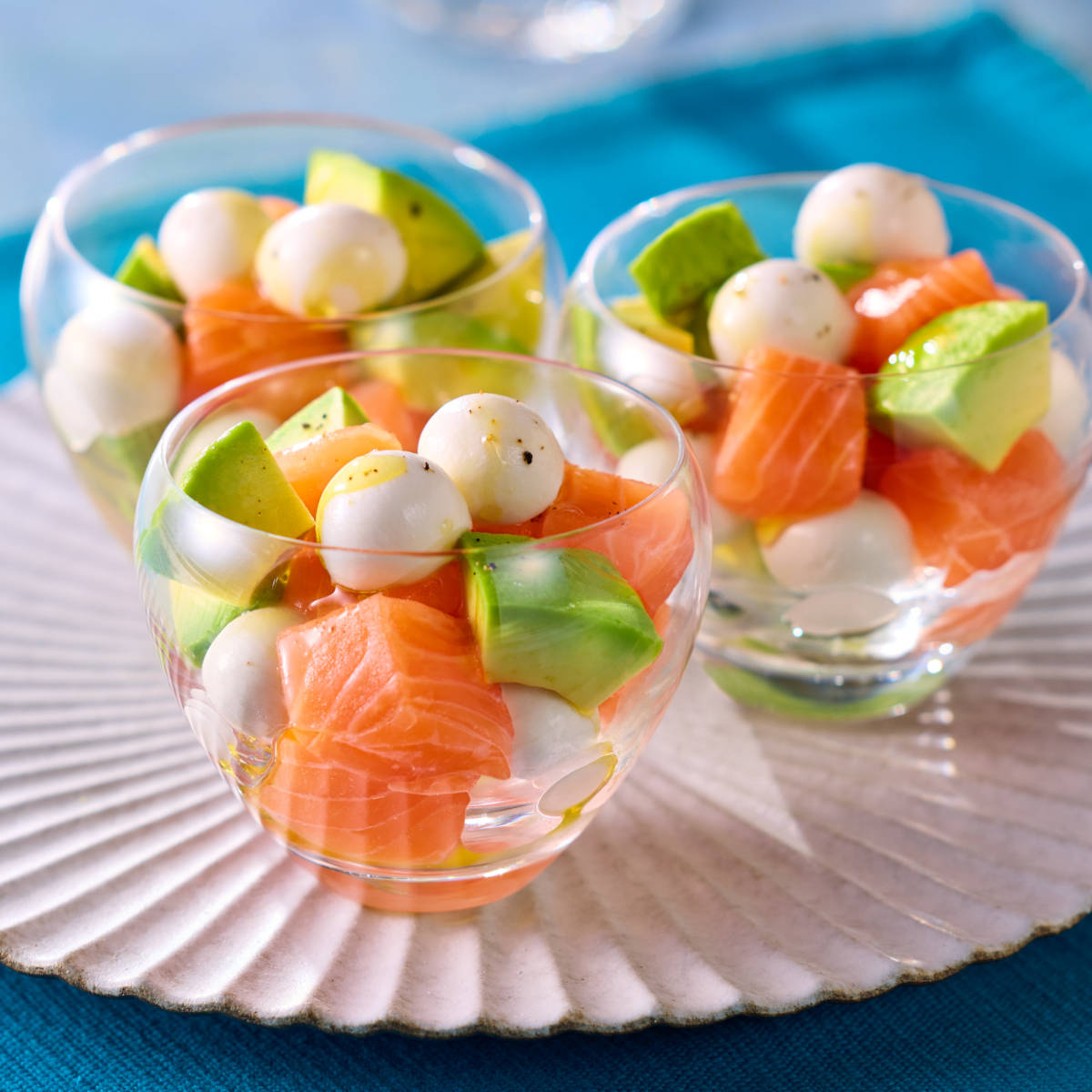 ひとくちモッツァレラで作るカラフルでおしゃれなグラスサラダ。モッツァレラのミルク感とサーモン、アボカドの旨みが重なる、見た目も味わいも華やかなひと品。