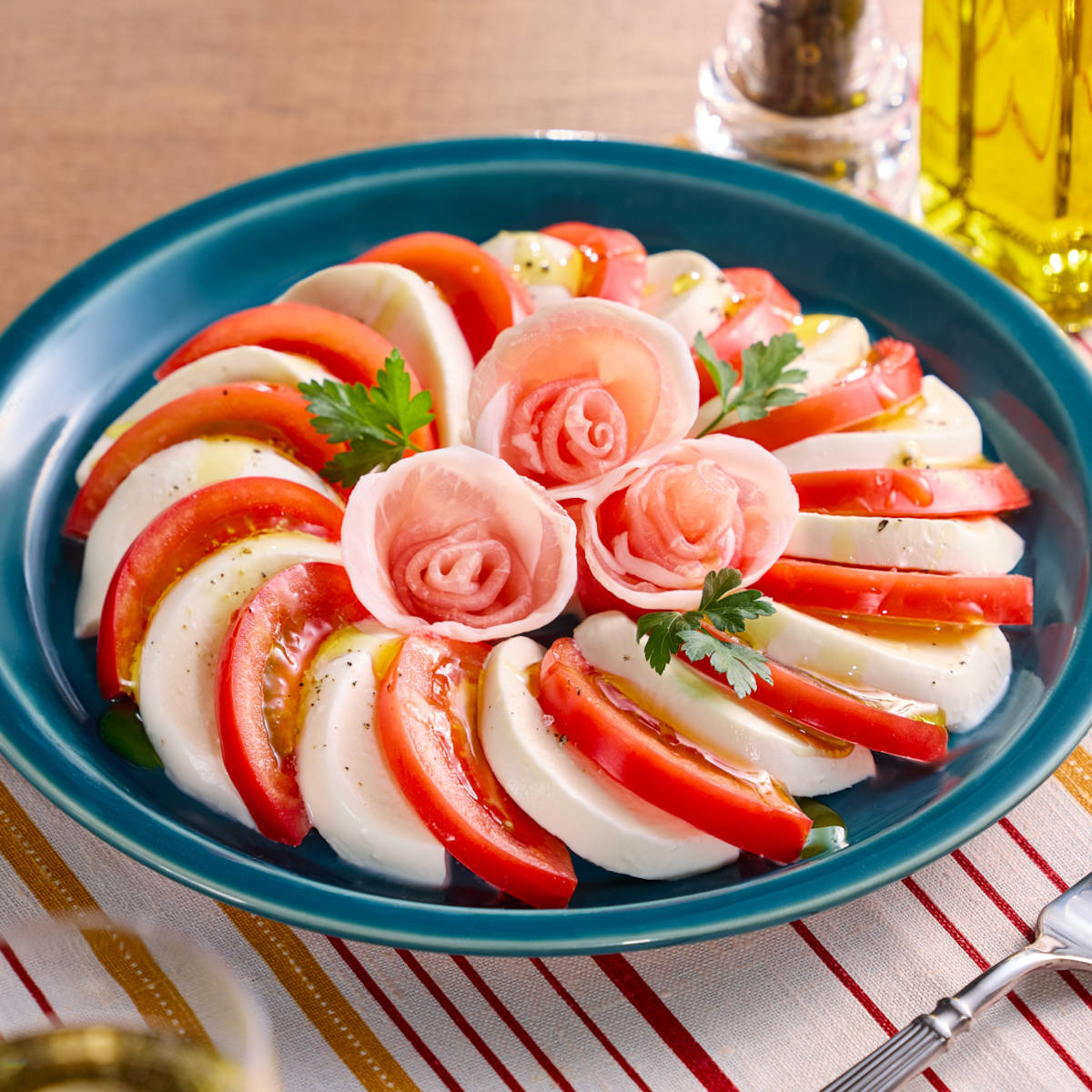 定番のカプレーゼにくるっと巻いた生ハムを添えて、まるでバラが咲いたようなひと皿に。手間をかけず、気分も食卓もパッと華やかに!