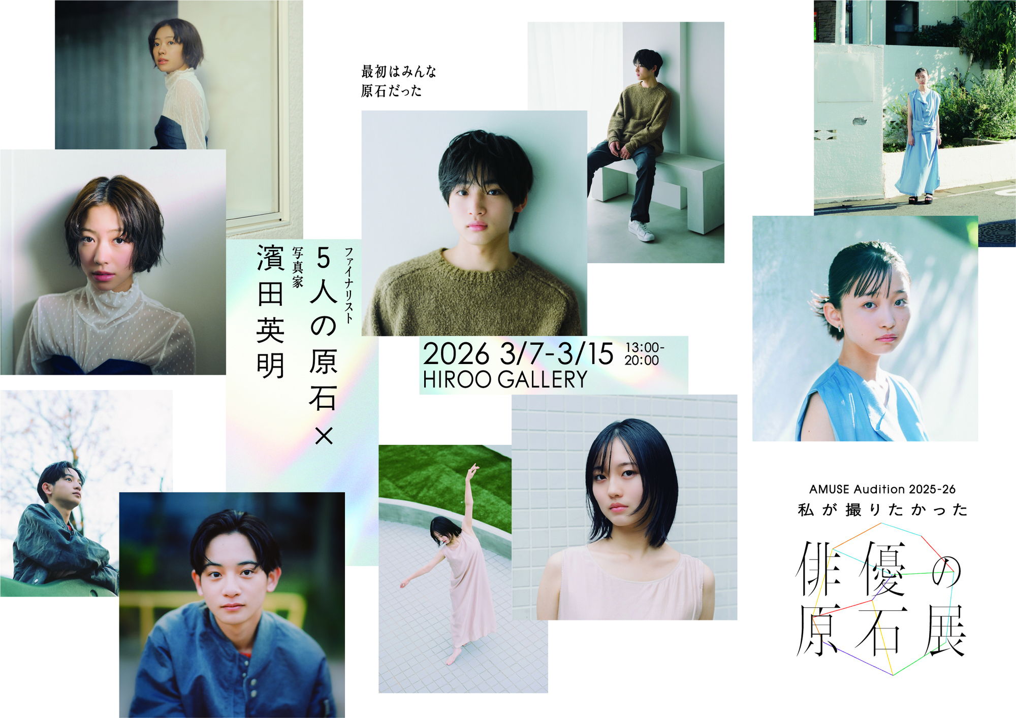大手芸能事務所アミューズは、AMUSE Audition 2025-26「私が撮りたかった俳優の原石展」の三次審査を通過したファイナリスト5名の写真展を、2026年3月7日(土)〜15日(日)にHIROO GALLERY(東京)にて開催する。