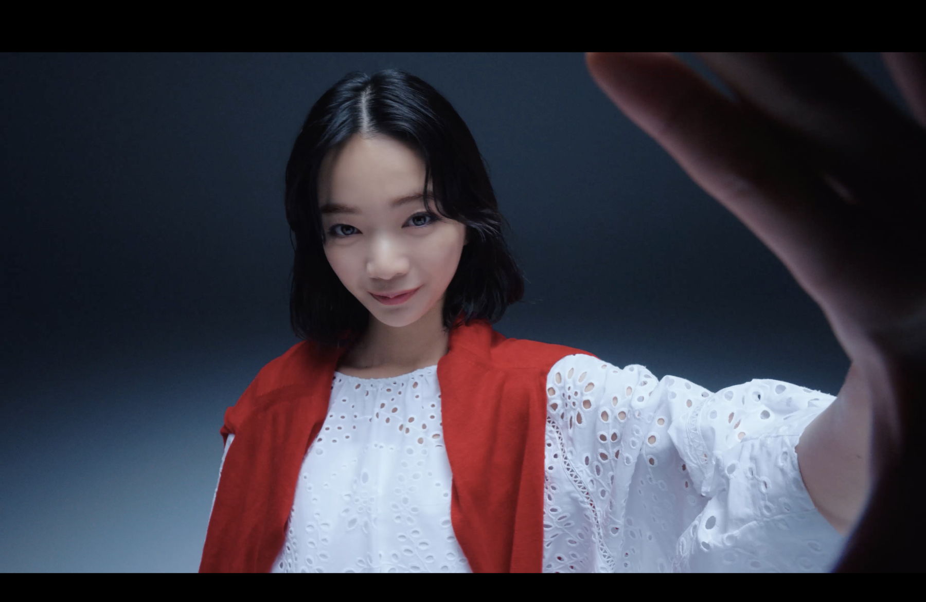 ジャケットにパンツを合わせたスタイリッシュなコーディネートで登場した見上。凛としたショートボブヘアと、カメラに向けるクールな眼差しが印象的。映像が横に流れると、オールホワイトコーデに身を包んだ彼女の姿が。次にカメラが動くと、柔らかなウェーブヘアに赤いカーディガンを肩にかけた姿で現れ、こちらに微笑みかける。照明も明るくチェンジ。キュートなウインクを送るその瞳に吸い込まれると、次はピンク色のニットにデニムを合わせたスタイルで登場。振り向いて、満面の笑顔を見せる。