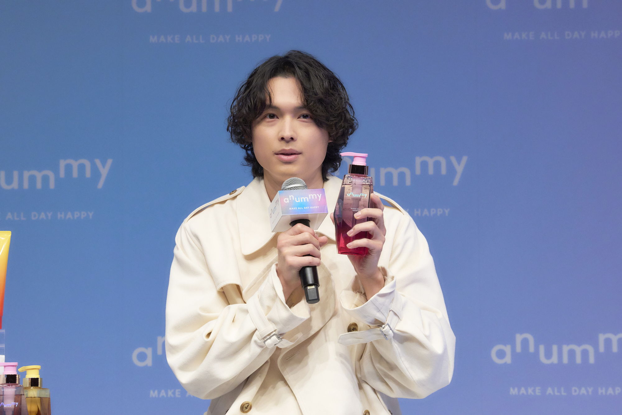 続くトークセッションでは、ブランドアンバサダーである松村が、ひと足早く使い始めた「anummy」のアイテムに言及。「僕は、しっとりタイプのアニュミー リペアメルティシャンプー&トリートメントを使っています。役で髪を伸ばしたりパーマをかけているのでパサつきが気になるのですが、シャンプーでも流した直後からパサつきを感じないです。香りも好きで、華やかアンバーローズという香りを知るきっかけにもなりました」と感想を語る。「アウトバスでも、ヘアミルクのエンリッチミルクが気に入っています。うるおいが足されてパサつきづらい感じです」と、「anummy」の「エンリッチミルク」を手に取りながら話していた。