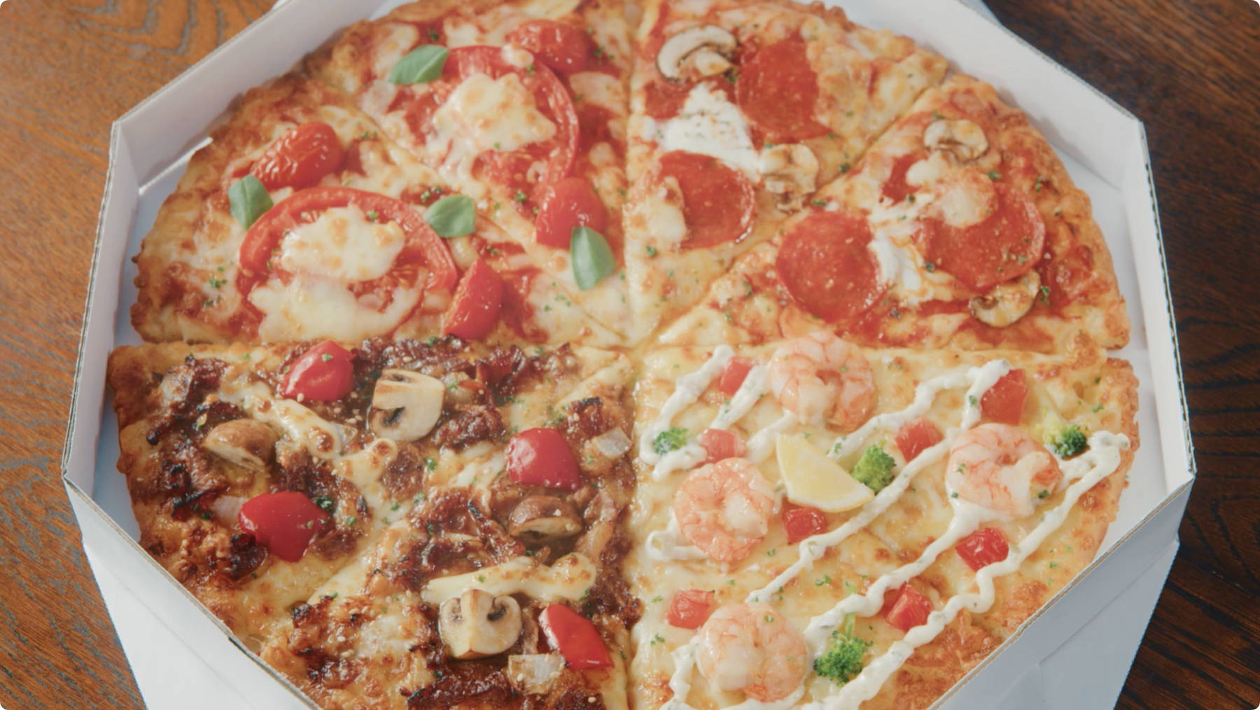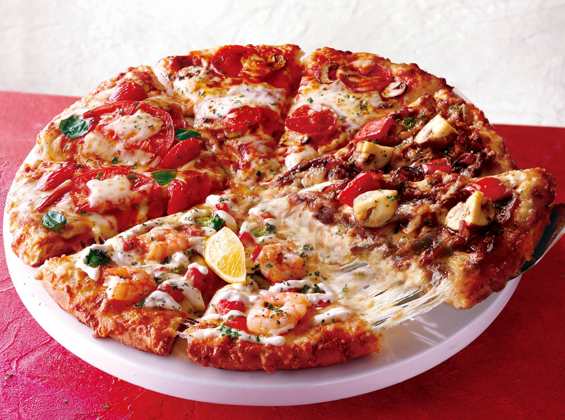 | 『春のプレミアムクォーター』は、今春の新作「プライムガーリックビーフ」 と「大海老のシーフードタルタル」に、王道の「フレッシュトマト&バジル」、「北海道産マスカルポーネ&熟成サラミ」の4種を1枚で楽しめる、プレミアムなクォーターピザ。 |