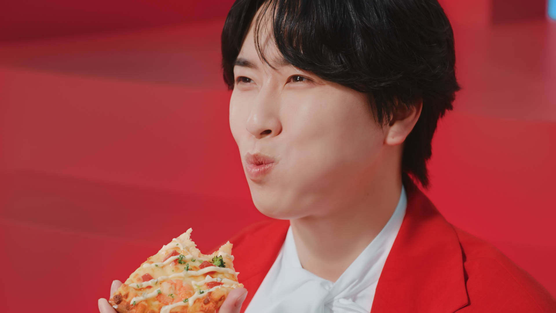 2025年冬のCM初登場に続き、2026年「春のプレミアムクォーター」のCMも宮舘涼太が出演。前回同様、常に高い集中力を保ち続ける姿勢と誠実なお人柄、さらに数々のシーンに散りばめられた美しい所作も加わって、現場の熱気はさらに高まる。「ピザーラお届け♪」のサウンドロゴに合わせて足を高く上げ軽やかに舞うシーンでは、無駄のない洗練された動きに、カットのたびに自然と拍手と歓声が湧き起こるほど。さらに宮舘のアレンジが加わり、まるでショーを観ているかのような一幕も。ピザーラの箱を開けるシーンの手の動きもすべて宮舘によるもので、その一つ一つにも美しさが感じられ、注目ポイントのひとつとなっている。