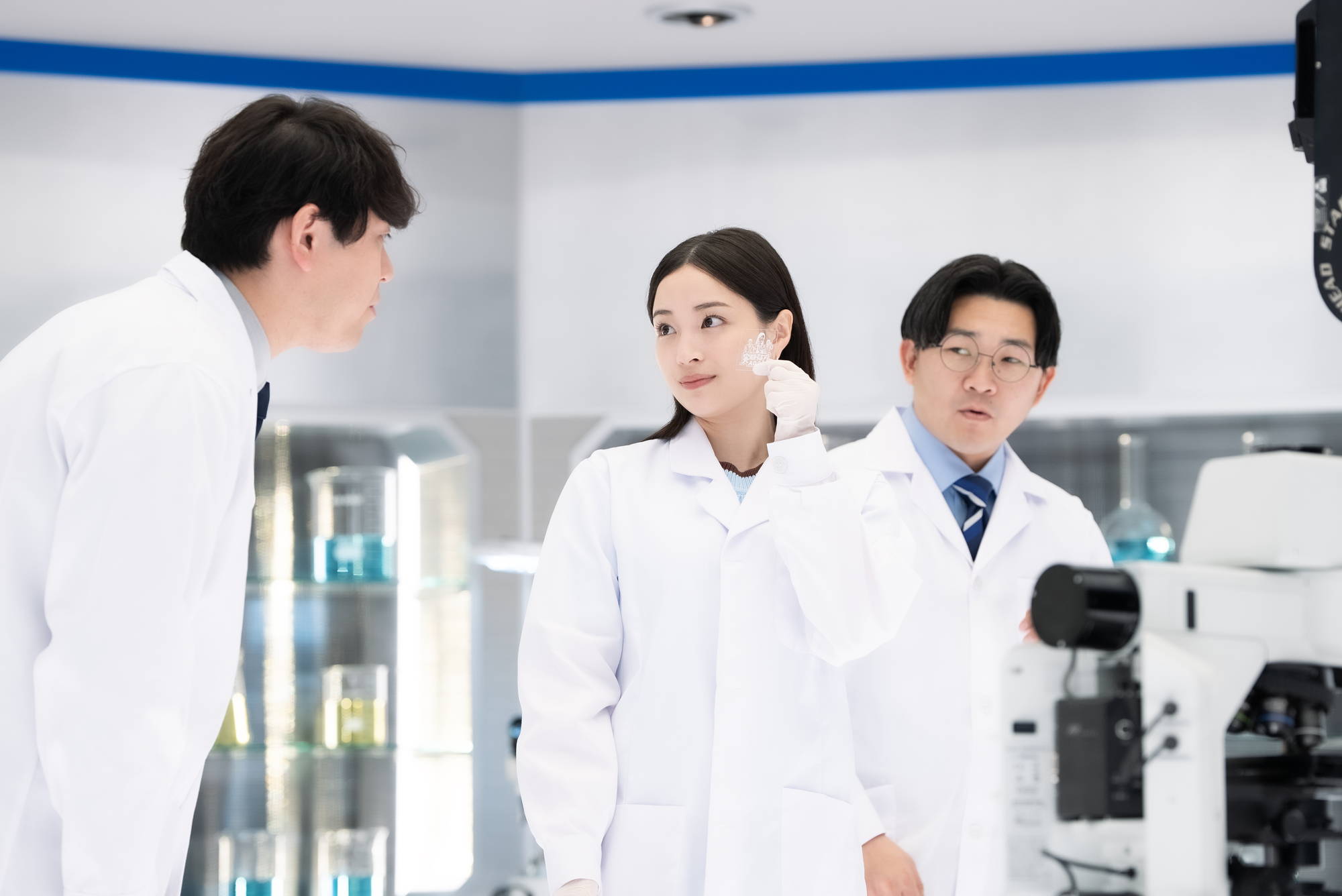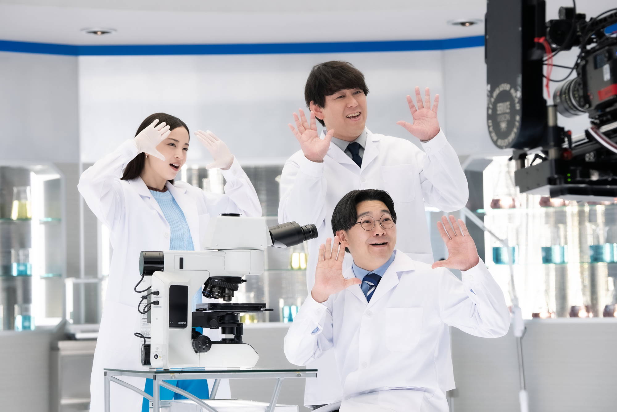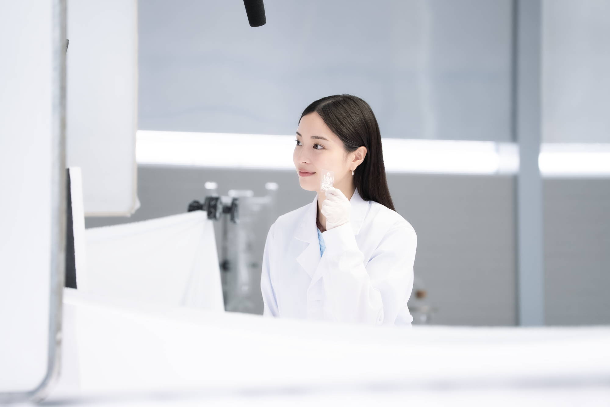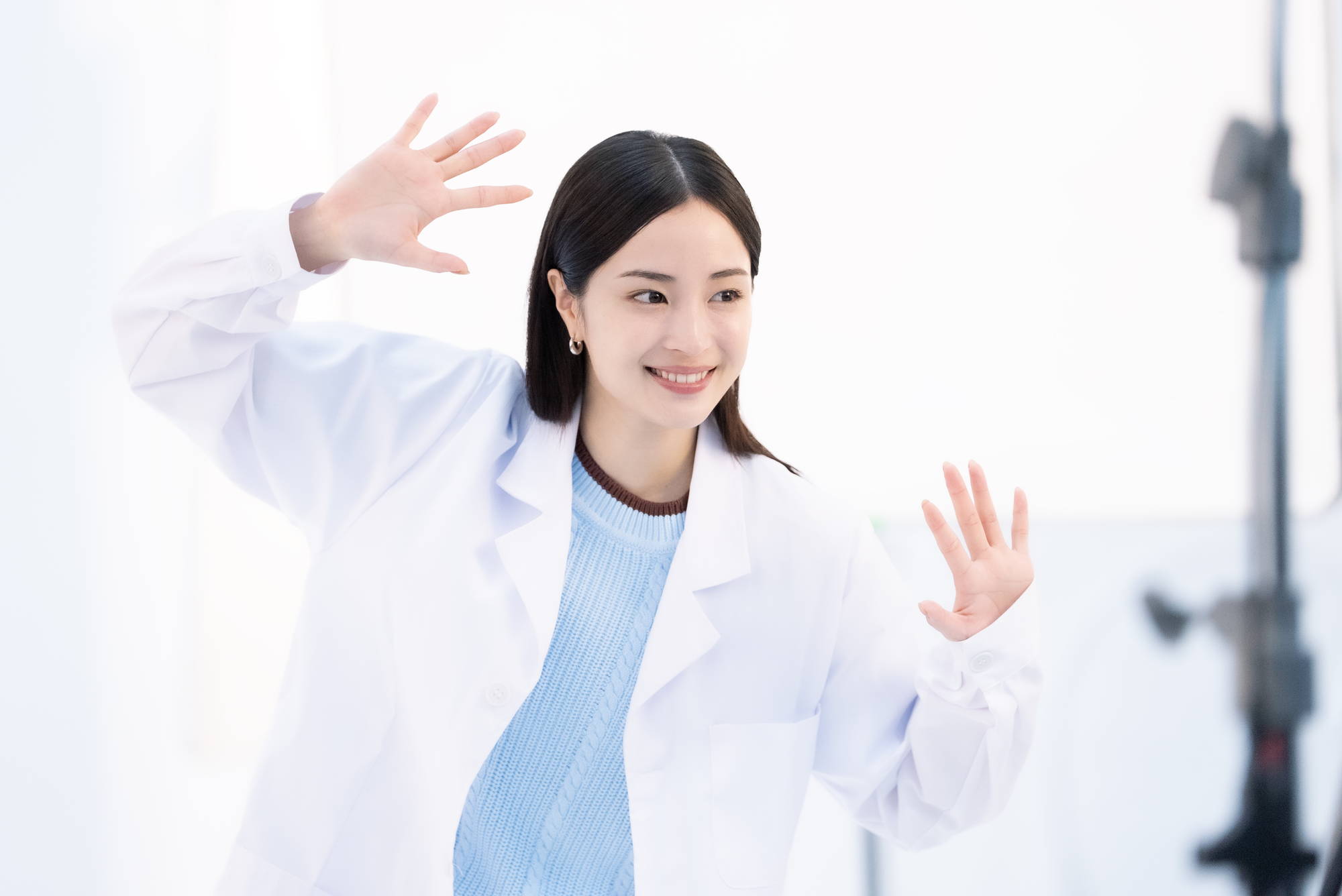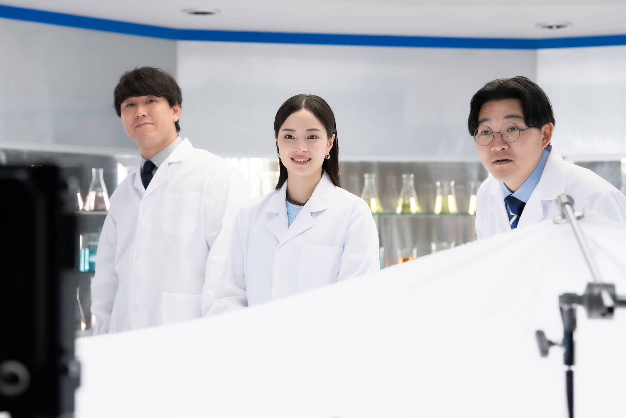 AGCの新CM「実験するぞ!AGC/ガラスコア篇」に登場したのは、昨年に引き続き女優の広瀬すず、お笑いコンビ・オズワルドの伊藤俊介、畠中悠。実験道具がずらりと並び、大きな顕微鏡もセッティングされた本格的なラボを舞台に、白衣姿の三人が撮影に臨んだ。コンテ説明の段階から和気あいあいとした雰囲気で、2年目のタッグならではの息の合った空気感が漂う。撮影の合間も三人の仲の良さが際立った。広瀬のセリフシーンから撮影がスタート。「ガラスコア」という微細な穴をあけたガラスを手にしながらのセリフも一発目からバッチリ。テストを経てすぐさま本番へ。三人の掛け合いもぴたりと決まり、あっという間にOKとなった。カメラが回っていない間もセリフをつぶやきながら練習する広瀬は、まさにクールな“すず先生”そのもの。一方で、助手役のオズワルドの二人と陽気に踊るコミカルな場面では、モニターを見ながら三人で大笑い。終始、コントさながらの掛け合いに思わず広瀬も吹き出すほど。髪の毛よりも小さい穴であることを伝えるため、畠中が伊藤の髪の毛を抜くシーンでは、「やめろ!」と伊藤が抵抗するも、さらに「半導体の未来を支えます!」という広瀬のセリフに合わせて、「俺の未来(髪の毛)を抜くな!」と伊藤がすかさず返すシーンもあり、現場は大爆笑。そしてクライマックスは三人で踊る「AGCダンス」。振り付けのタイミングを何度も確認しながら練習を重ねる。「広瀬さん完璧です!」というスタッフからの声に、一人だけなかなかタイミングが合わない伊藤が、「すず様が早いってことはないですか?」と即座にひとボケ。「型にとらわれず楽しんで」とのスタッフからの言葉に「信じますよ!」と伊藤が応じ、何度かテイクを重ね、無事スタッフからOKをもらうと、伊藤もホッとした表情に。クールな研究者とにぎやかな助手たち。三人の抜群のチームワークとともに常に笑いあふれる撮影現場となった。コミカルでテンポ感あふれる新TV-CMに、注目だ!