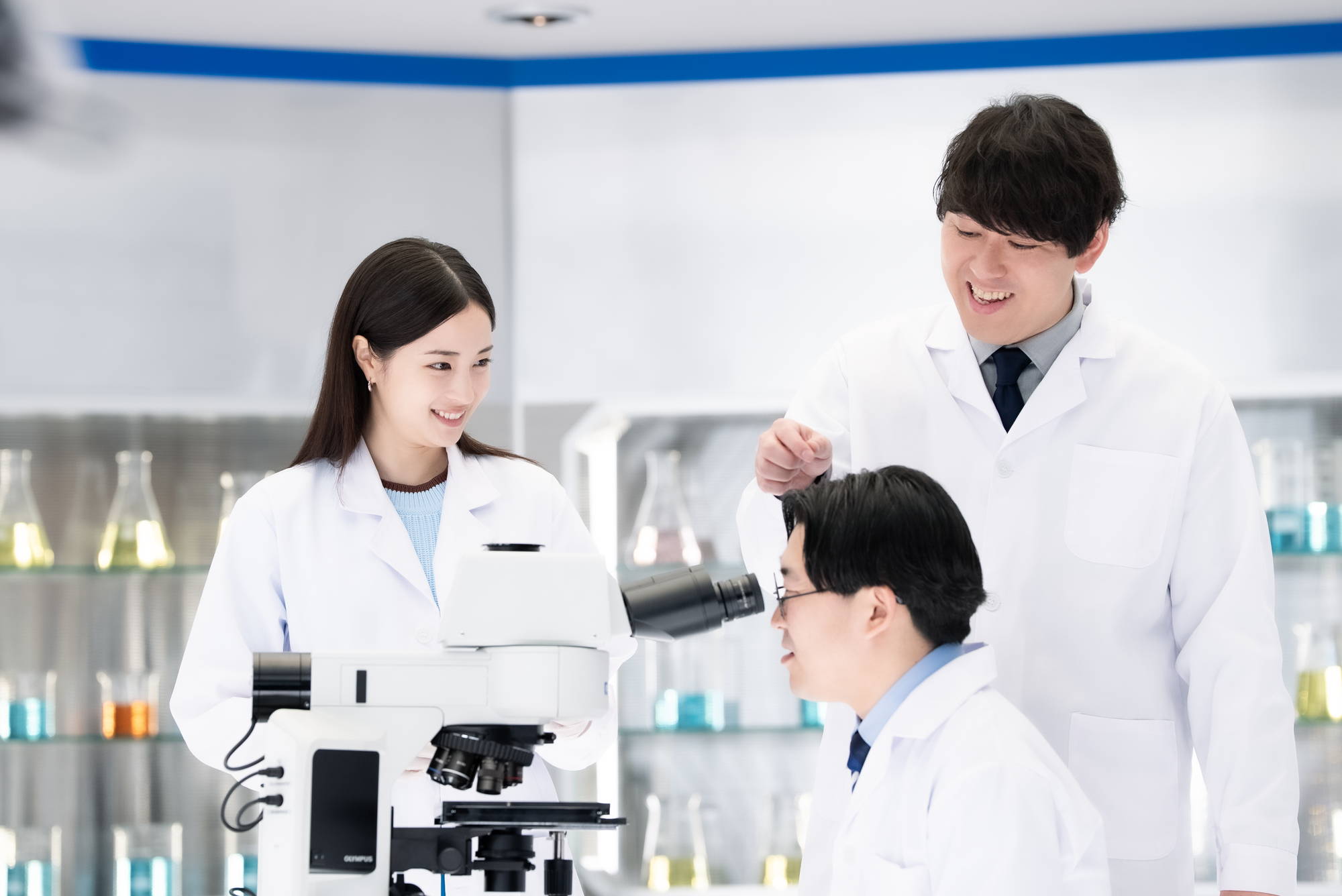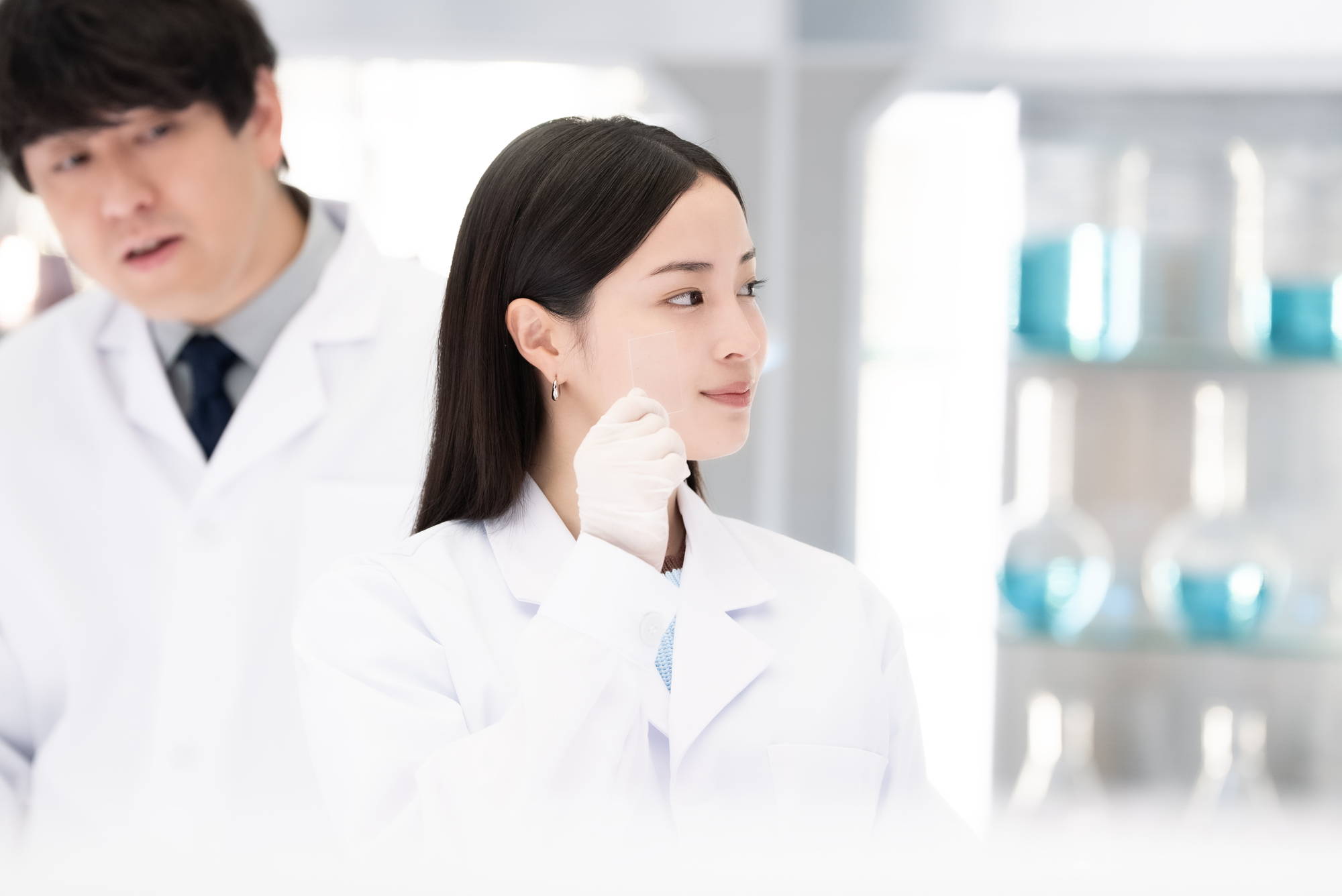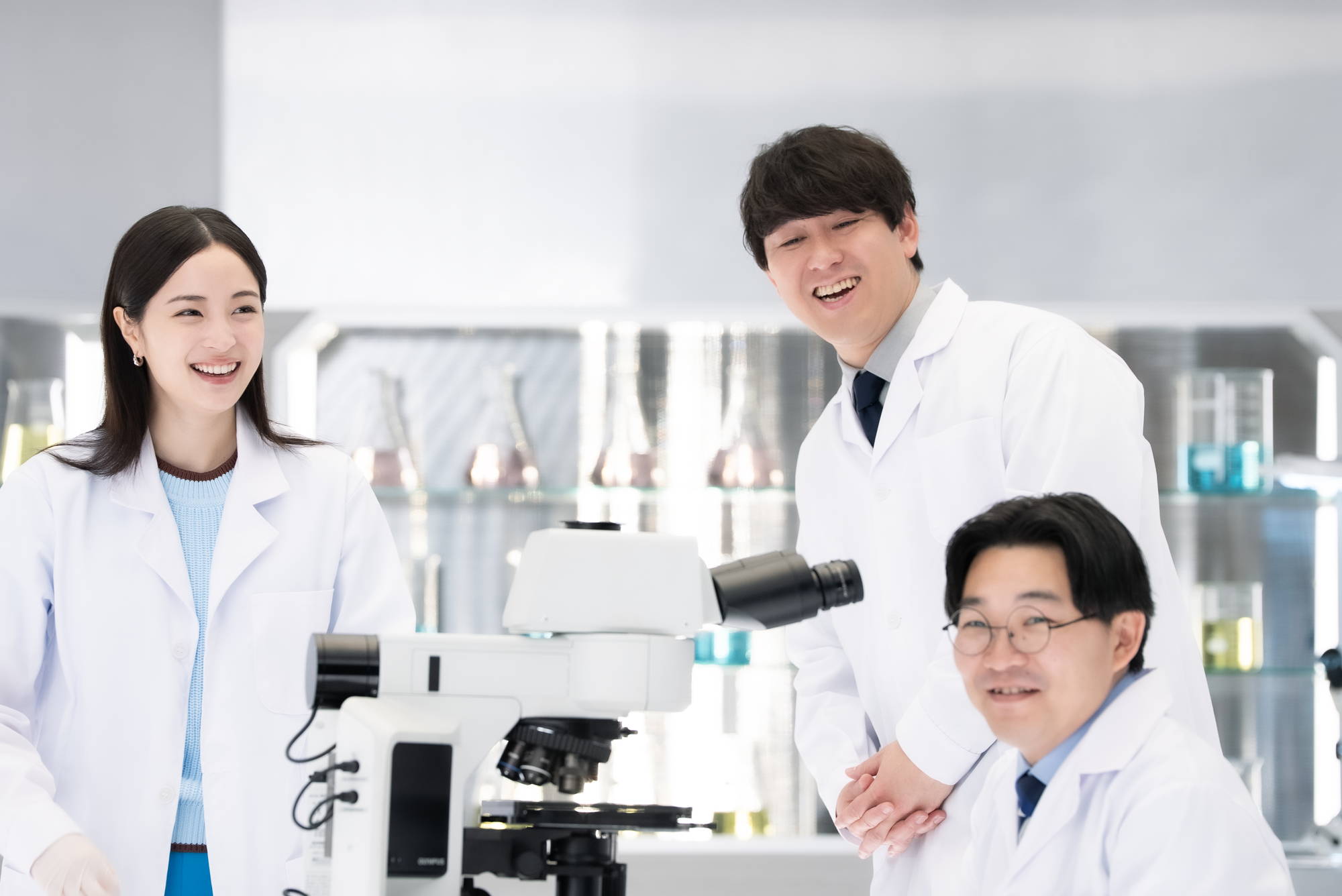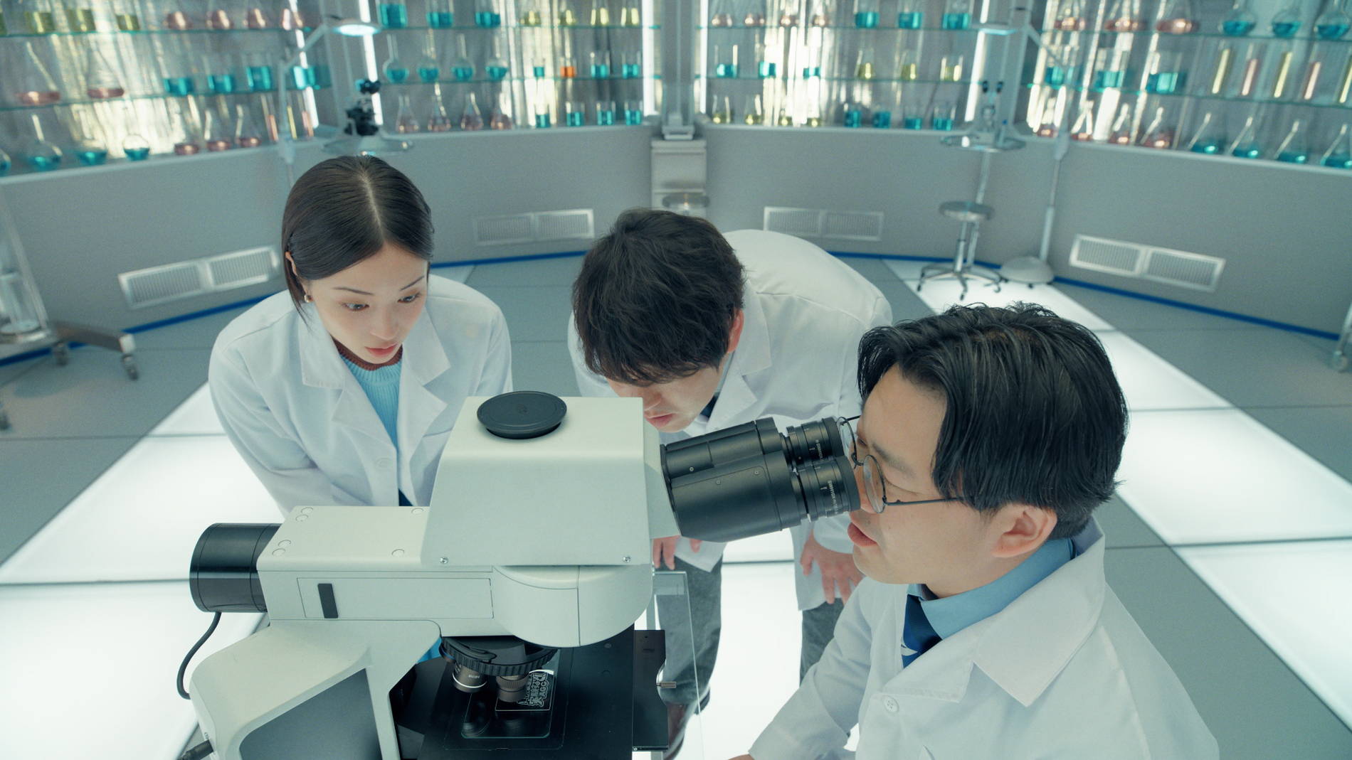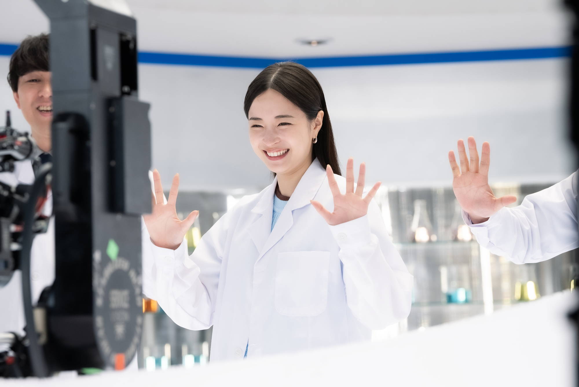 AGCの新CM「実験するぞ!AGC/ガラスコア篇」に登場したのは、昨年に引き続き女優の広瀬すず、お笑いコンビ・オズワルドの伊藤俊介、畠中悠。実験道具がずらりと並び、大きな顕微鏡もセッティングされた本格的なラボを舞台に、白衣姿の三人が撮影に臨んだ。コンテ説明の段階から和気あいあいとした雰囲気で、2年目のタッグならではの息の合った空気感が漂う。撮影の合間も三人の仲の良さが際立った。広瀬のセリフシーンから撮影がスタート。「ガラスコア」という微細な穴をあけたガラスを手にしながらのセリフも一発目からバッチリ。テストを経てすぐさま本番へ。三人の掛け合いもぴたりと決まり、あっという間にOKとなった。カメラが回っていない間もセリフをつぶやきながら練習する広瀬は、まさにクールな“すず先生”そのもの。一方で、助手役のオズワルドの二人と陽気に踊るコミカルな場面では、モニターを見ながら三人で大笑い。終始、コントさながらの掛け合いに思わず広瀬も吹き出すほど。髪の毛よりも小さい穴であることを伝えるため、畠中が伊藤の髪の毛を抜くシーンでは、「やめろ!」と伊藤が抵抗するも、さらに「半導体の未来を支えます!」という広瀬のセリフに合わせて、「俺の未来(髪の毛)を抜くな!」と伊藤がすかさず返すシーンもあり、現場は大爆笑。そしてクライマックスは三人で踊る「AGCダンス」。振り付けのタイミングを何度も確認しながら練習を重ねる。「広瀬さん完璧です!」というスタッフからの声に、一人だけなかなかタイミングが合わない伊藤が、「すず様が早いってことはないですか?」と即座にひとボケ。「型にとらわれず楽しんで」とのスタッフからの言葉に「信じますよ!」と伊藤が応じ、何度かテイクを重ね、無事スタッフからOKをもらうと、伊藤もホッとした表情に。クールな研究者とにぎやかな助手たち。三人の抜群のチームワークとともに常に笑いあふれる撮影現場となった。コミカルでテンポ感あふれる新TV-CMに、注目だ!