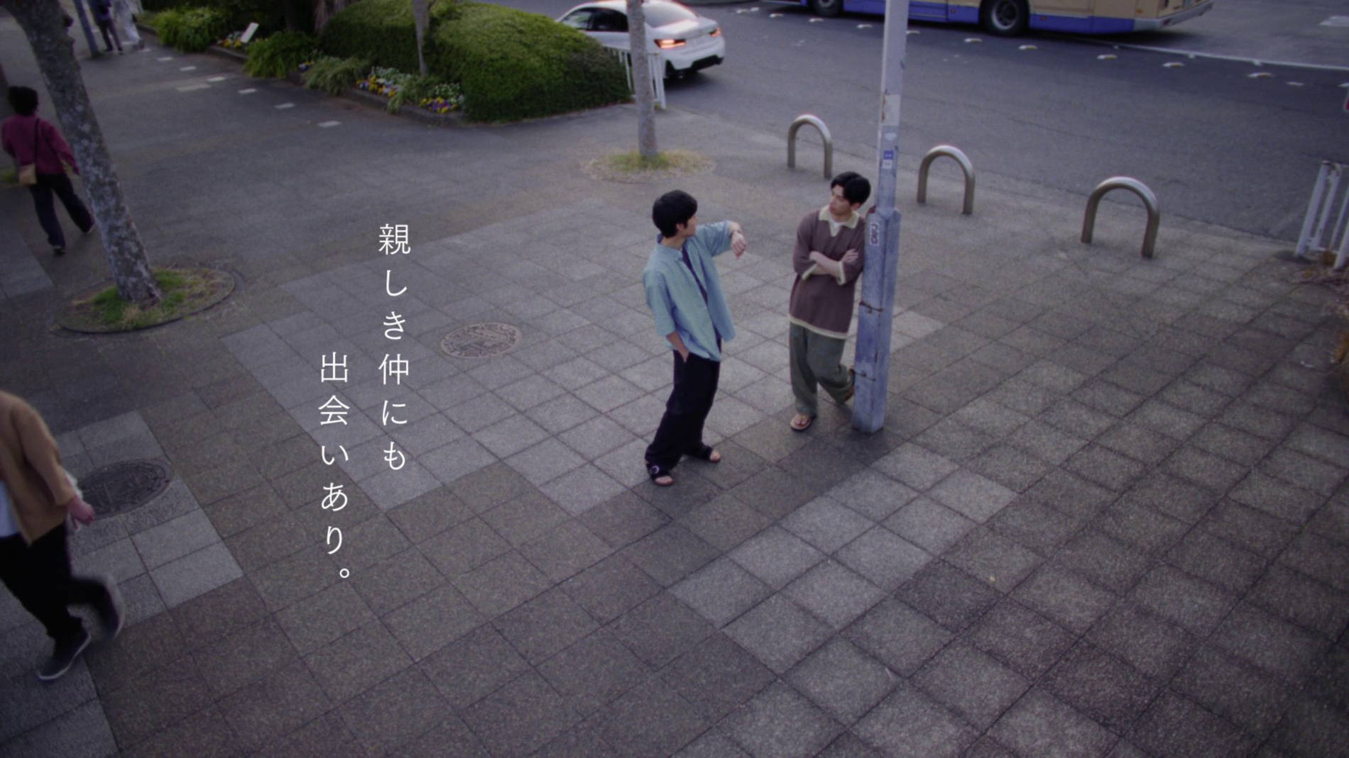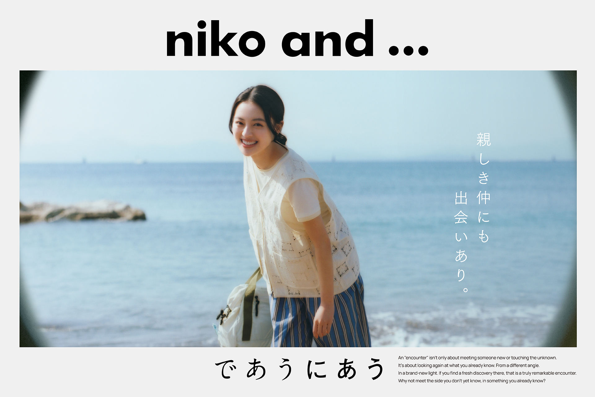 上坂樹里と、親友役の小林桃子が出演する「ともだち篇」の舞台は、とある海辺。大学を卒業し、地元を離れ久々に出会った気心が知れた友人同士、はしゃいで駆け回っていると、上坂がぽつりと「好きな人できてさ。たまらなく好きで、伝えようとしたの。でも、やめちゃったんだよね」と打ち明ける。それに対して友人が「なんか今の世界ってさ。ホントのふりした嘘ばっかじゃん?だからその『好き』っていうホントは、飲み込んだらダメなやつだよ」と、さらりと語る親友。「…あんたってそんな熱かったっけ?」驚く上坂樹里。親友は得意げな表情で二人でくすくすと笑い合う。付き合いが長く何でも知っているはずだった親友の、新たな一面に出会った瞬間だった。親しき仲にも出会いあり。であうにあう 「niko and …」(歌:東郷清丸)