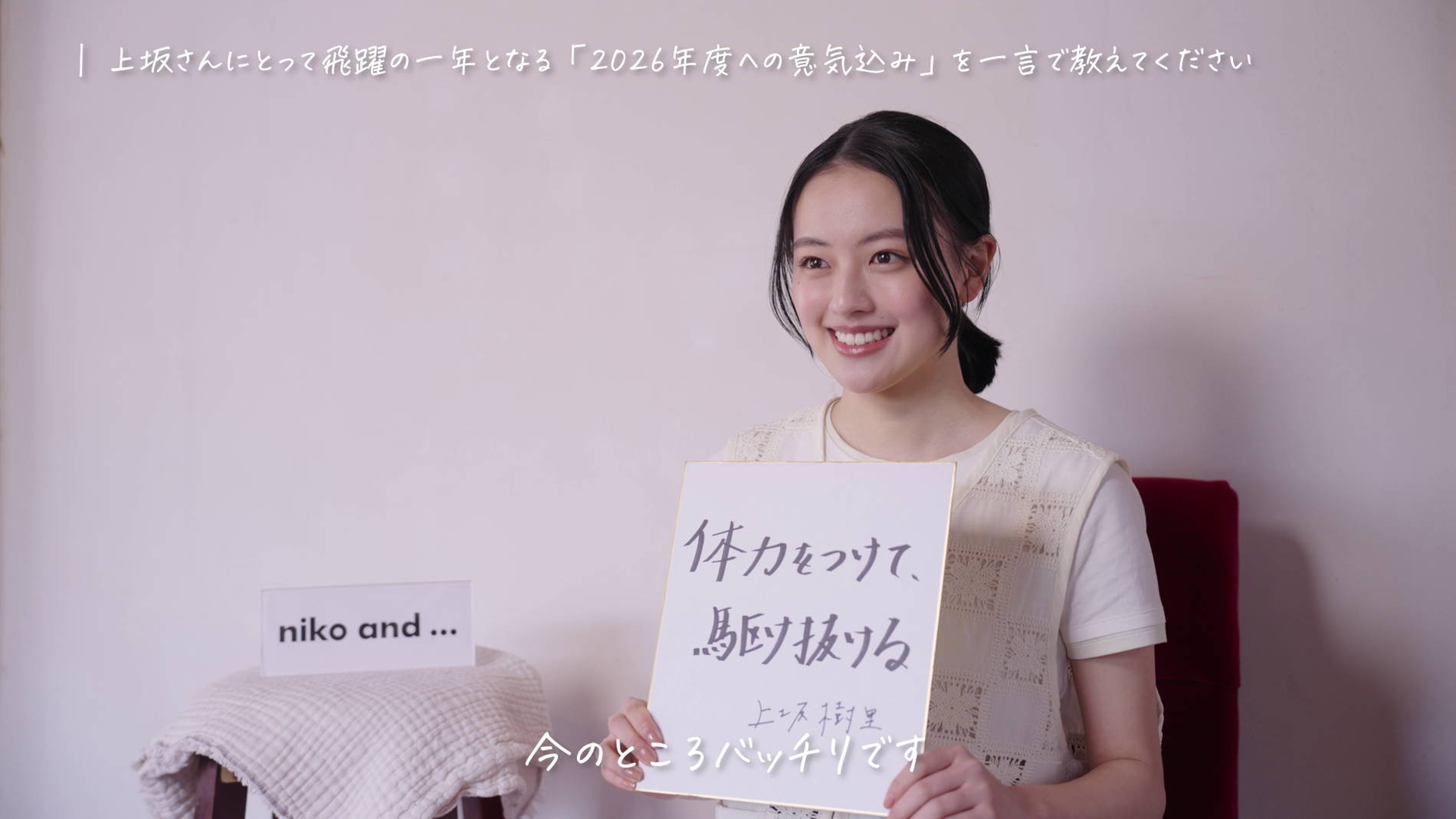 上坂:「体力をつけて、駆け抜ける」です。今は本当に毎日お仕事が楽しくて、その分やっぱり健康が一番大事だなと思うので、しっかりご飯を食べて、たくさん寝て体力をつけて、2026年を駆け抜けられたらいいなという思いでこの言葉を書きました。今のところバッチリです。