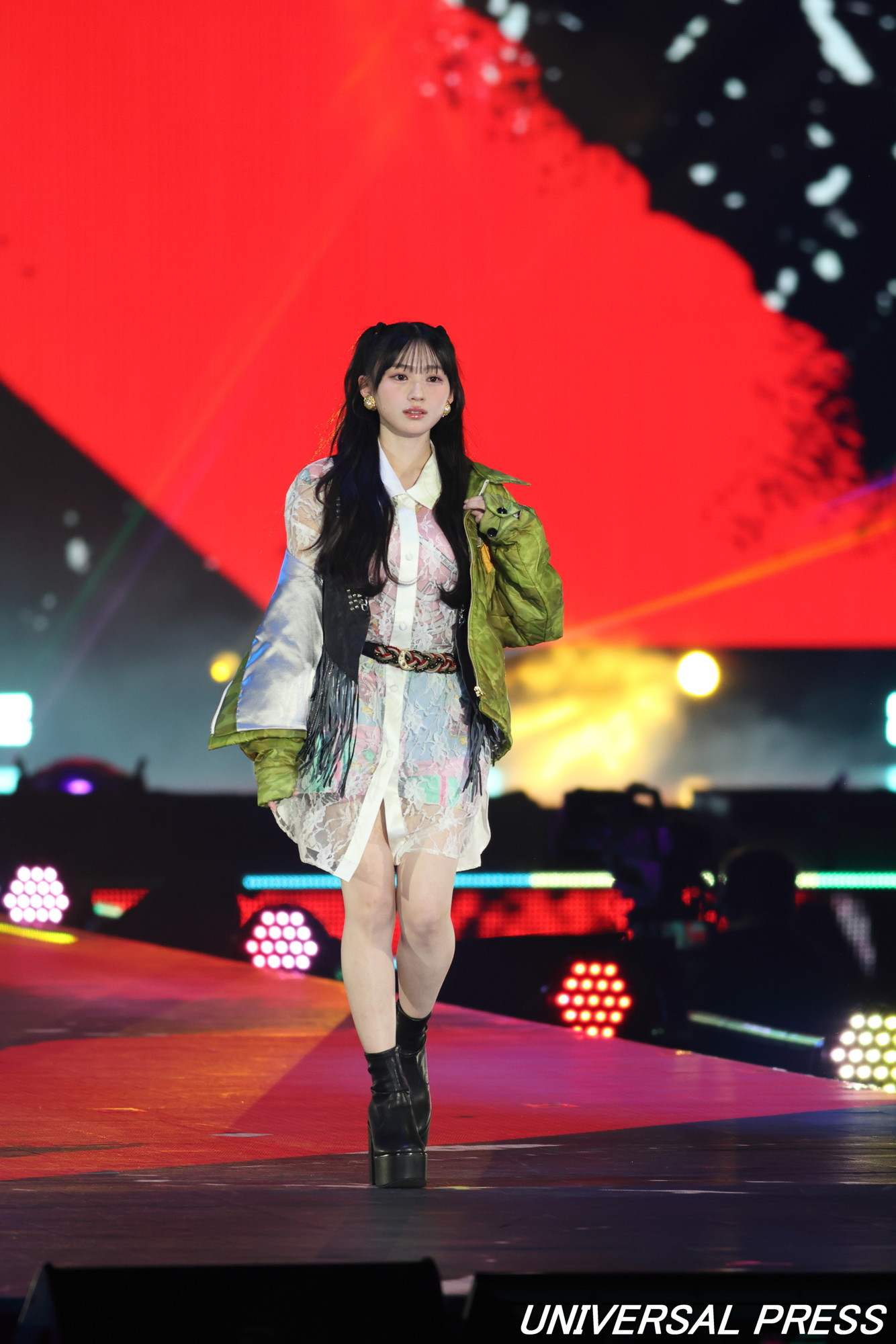 GRAPEFRUIT MOONのステージでは迷彩柄のヴィンテージライクなキルティングジャケットにレース生地のロングシャツ、ロックなレザーベストを合わせ、美脚がチラリ。