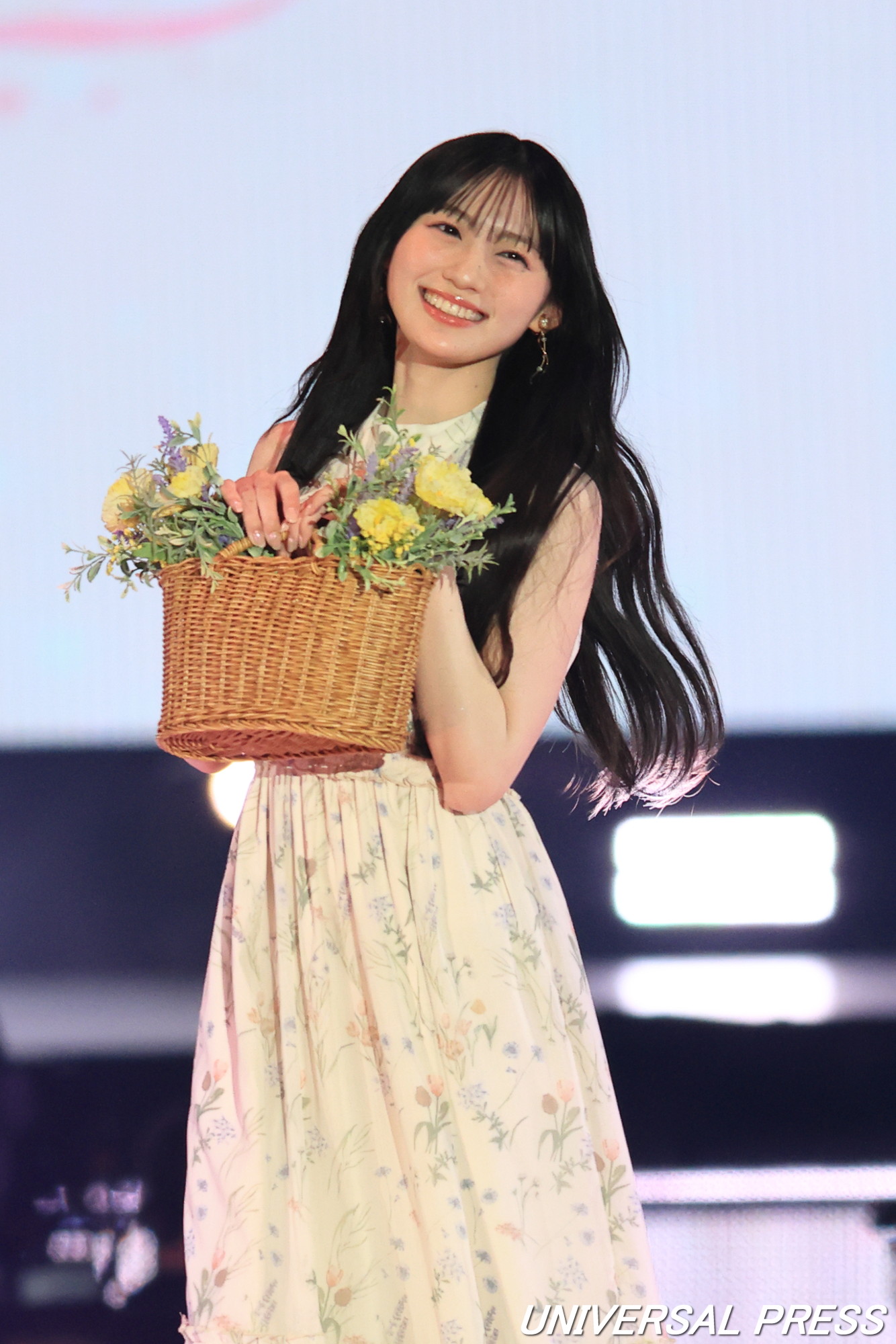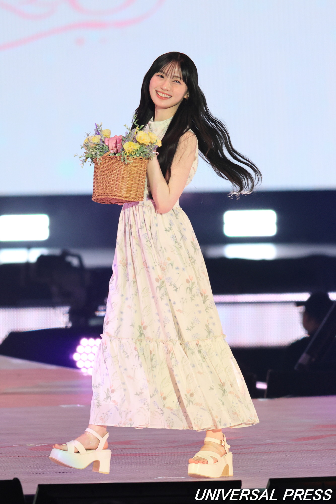 Án MILLEのステージでは上品でガーリーな花柄のノースリーブワンピース、衣装とリンクするように花が詰められたバスケットバッグでランウェイ。観客からの声援に応えていた。