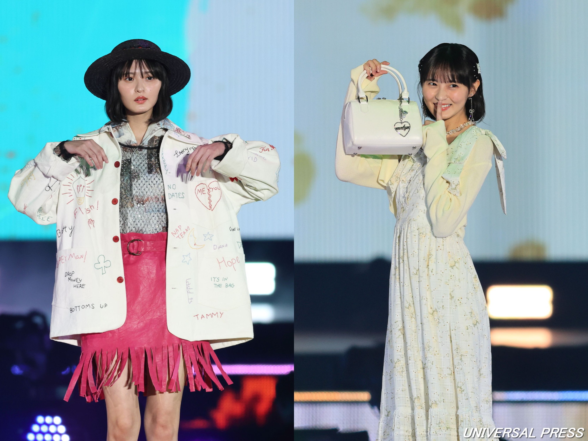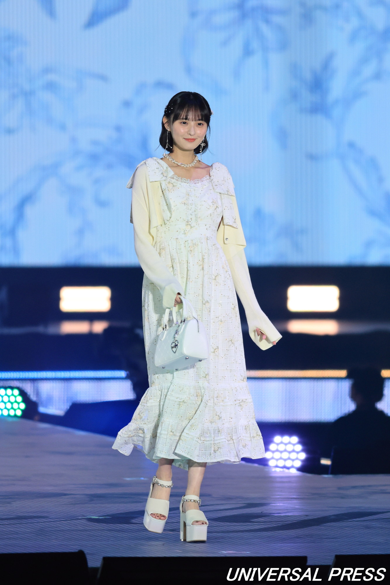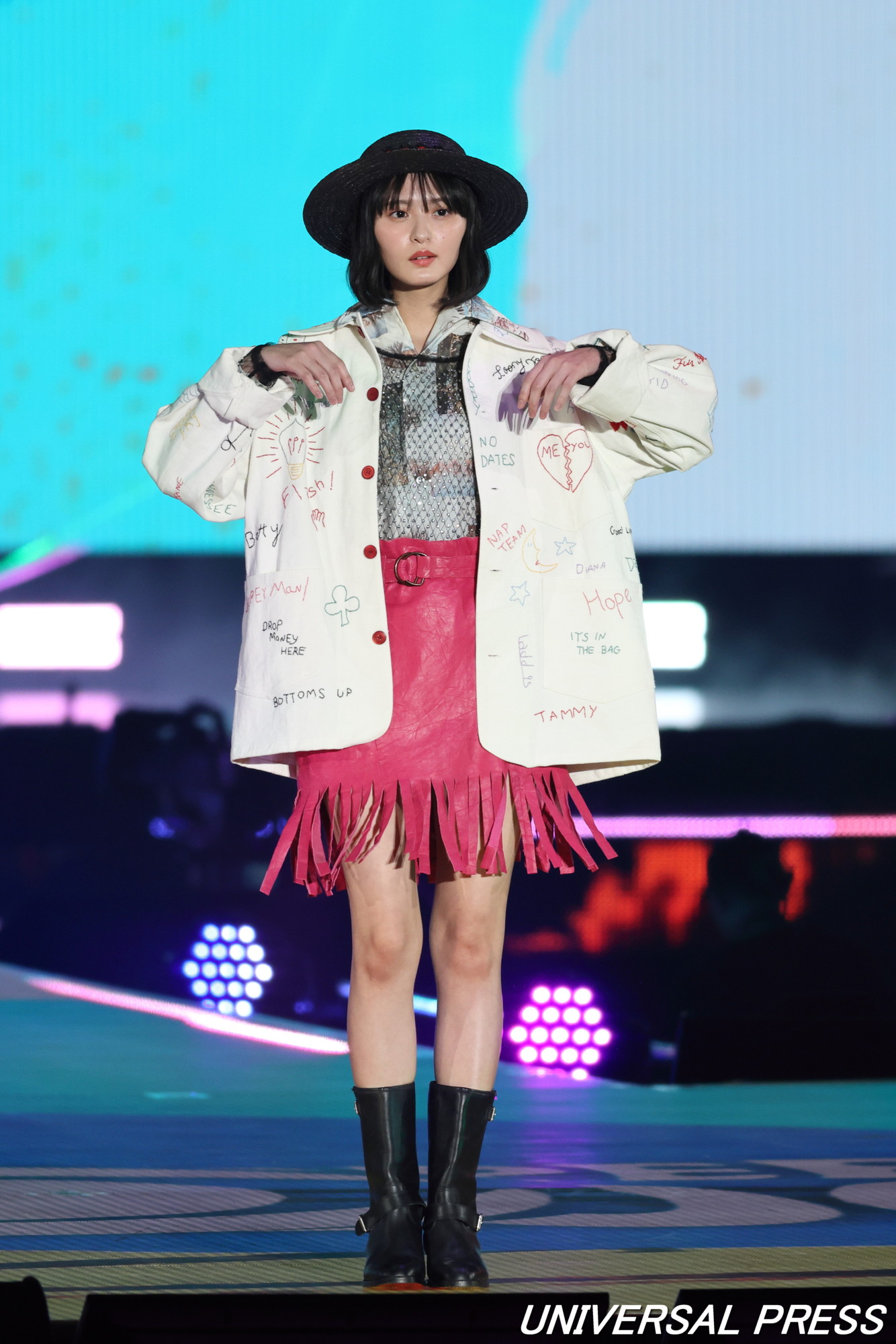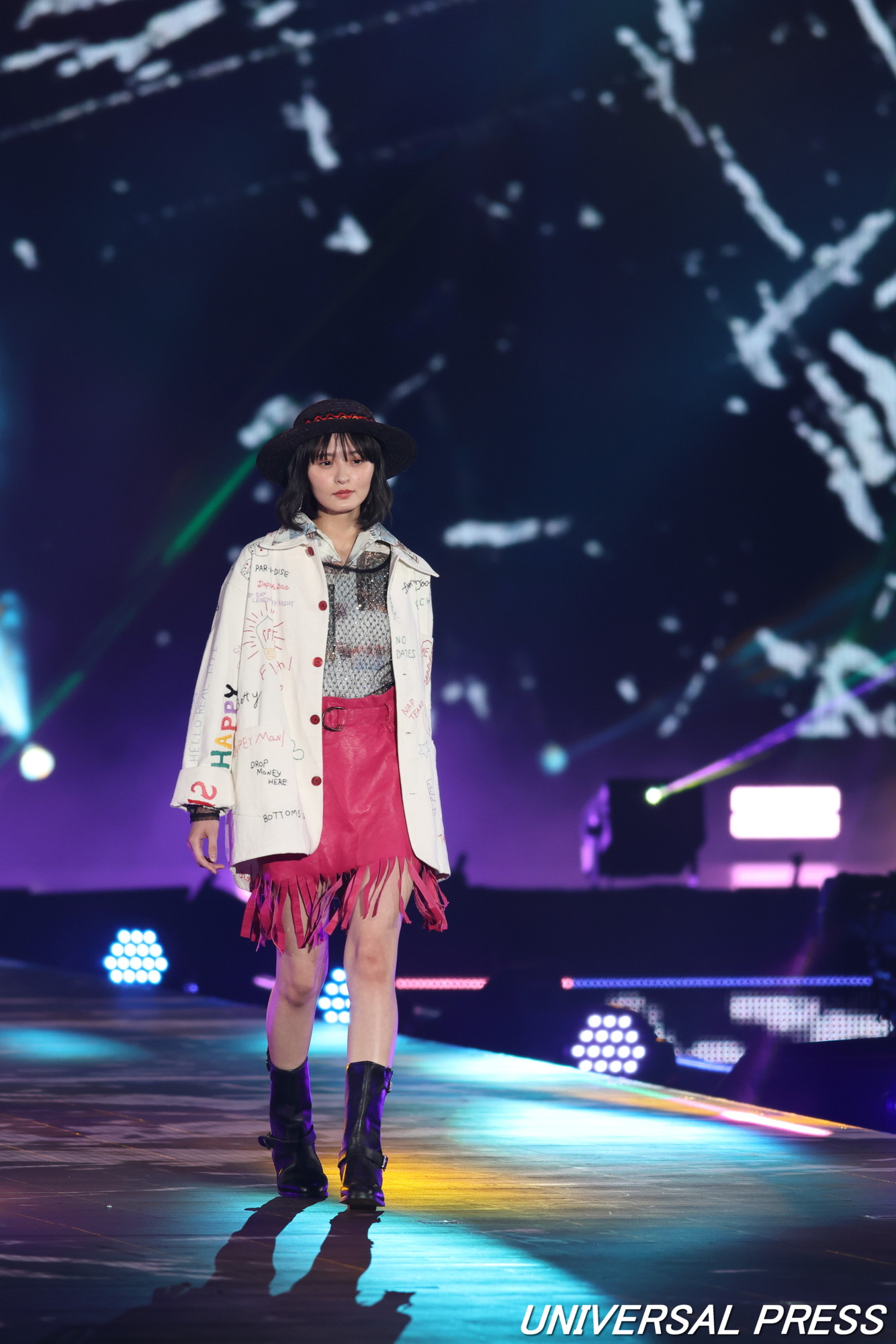 Grapefruit Moonのステージでは白い刺繍カバーオールジャケットに、メッシュ素材の透け感に合わせたシャツ、鮮やかなピンクが印象的なフリンジ状にカットされたスカートで登場。ランウェイトップではハニカミながら“舌ペロ”を披露した。