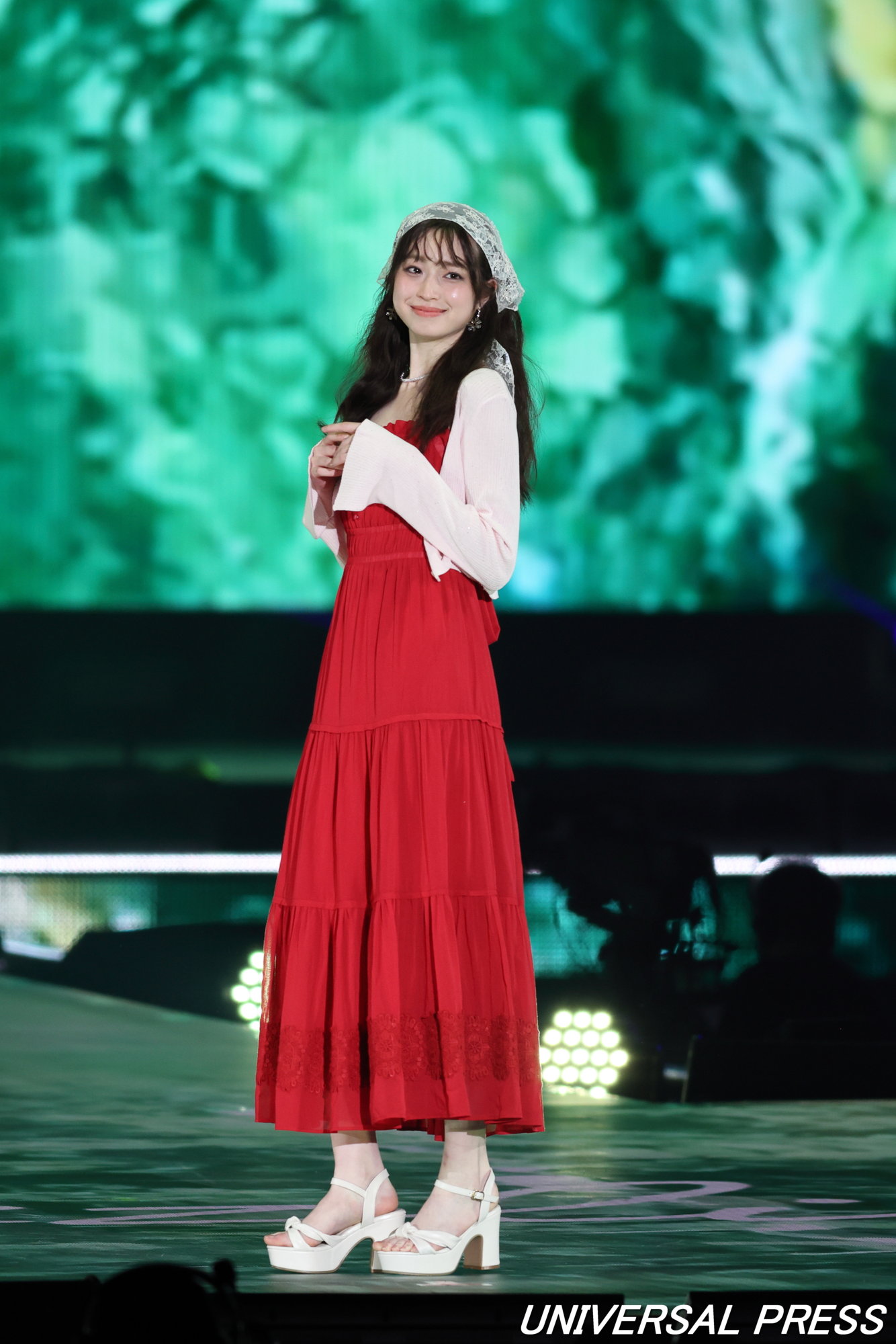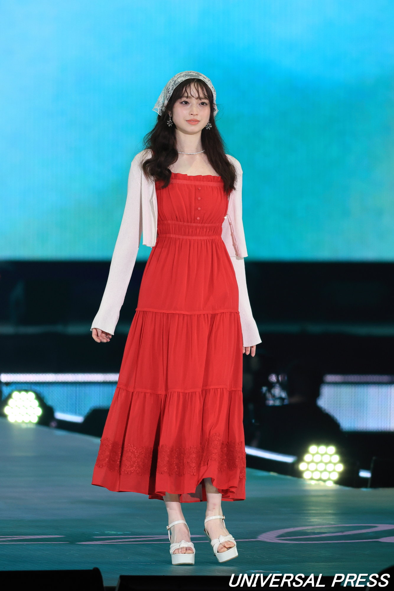 dazzlin(ダズリン)ステージでは、パッと目を引く赤のワンピースに白のカーディガン。レースのヘッドアクセを合わせ甘すぎないガーリーさを表現。