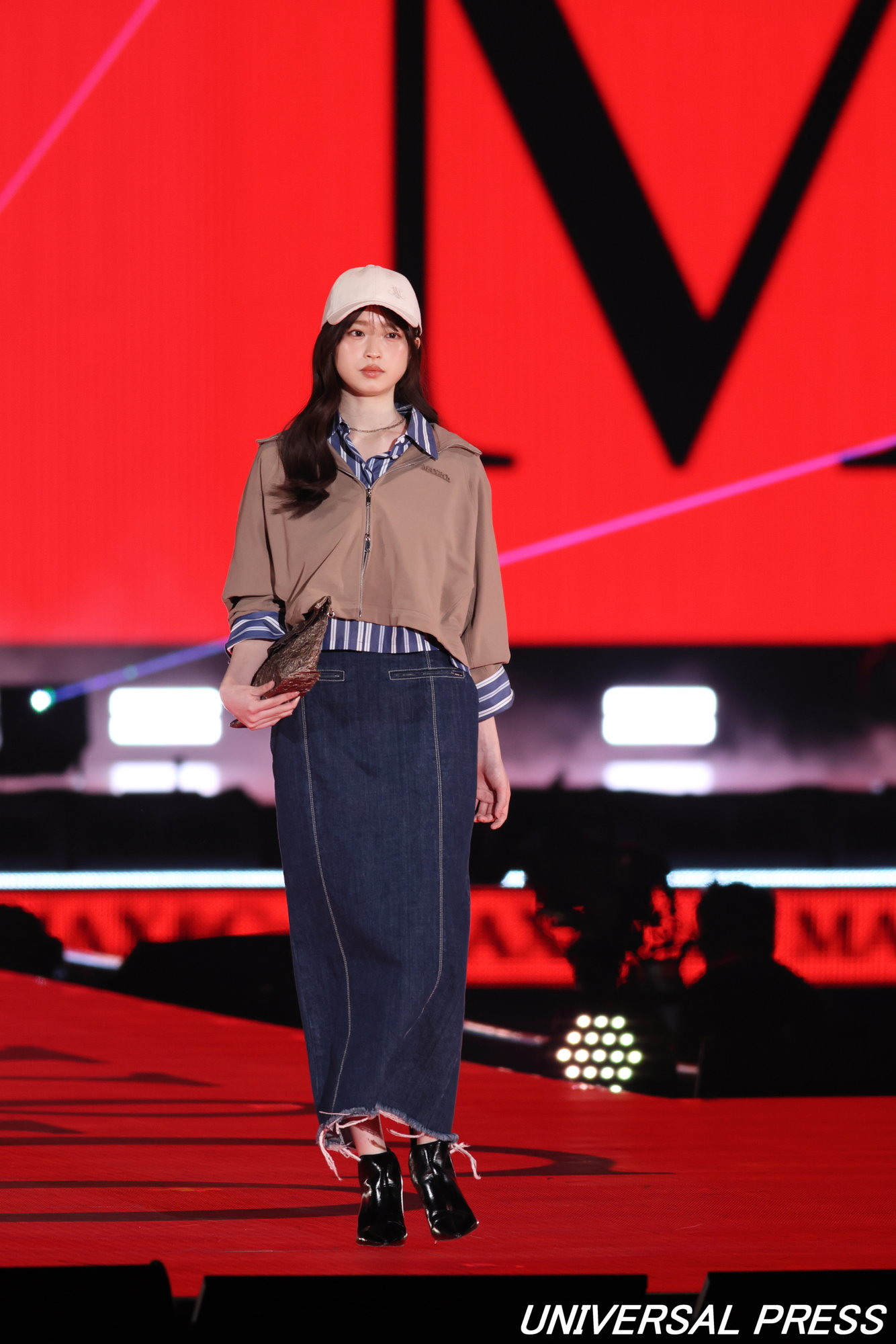 イタリア生まれのファッションブランド「MAX&Co.」ステージはストライプのクロップドシャツにブラウンのトップス、デニムスカートを合わせたコーデ。